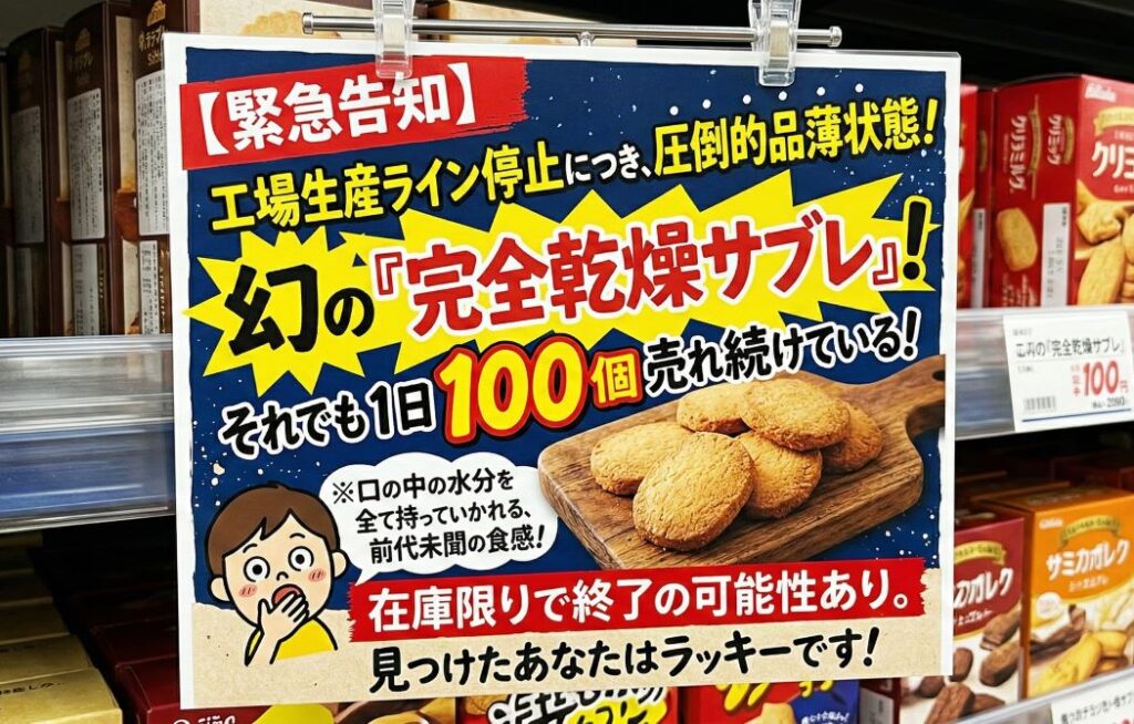 【緊急告知】 現在、工場生産ライン停止につき、圧倒的品薄状態! それでも1日100個売れ続けている、幻の『完全乾燥サブレ』! ※口の中の水分を全て持っていかれる、前代未聞の食感! 在庫限りで終了の可能性あり。見つけたあなたはラッキーです!