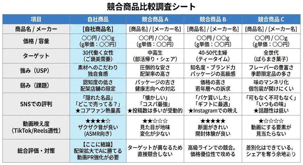 お菓子メーカーの営業部長です。 競合商品との比較表を作りたいです。 上司に報告するための「競合調査 テンプレート」を表形式で作成してください。 項目は「価格」「ターゲット」「強み」「弱み」「SNSでの評判」「動画映え度」を含めてください。