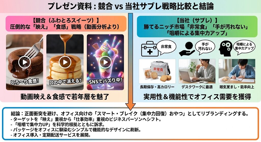 - 表の左側: 競合(ふわとろスイーツ)の圧倒的な「映え」「食感」戦略(動画分析より)