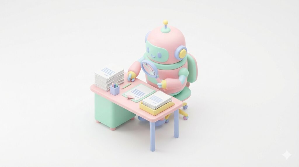 「3Dレンダリングされた可愛いロボットが、虫眼鏡を持って書類をチェックしている、アイソメトリック視点、パステルカラー、白背景、高品質」