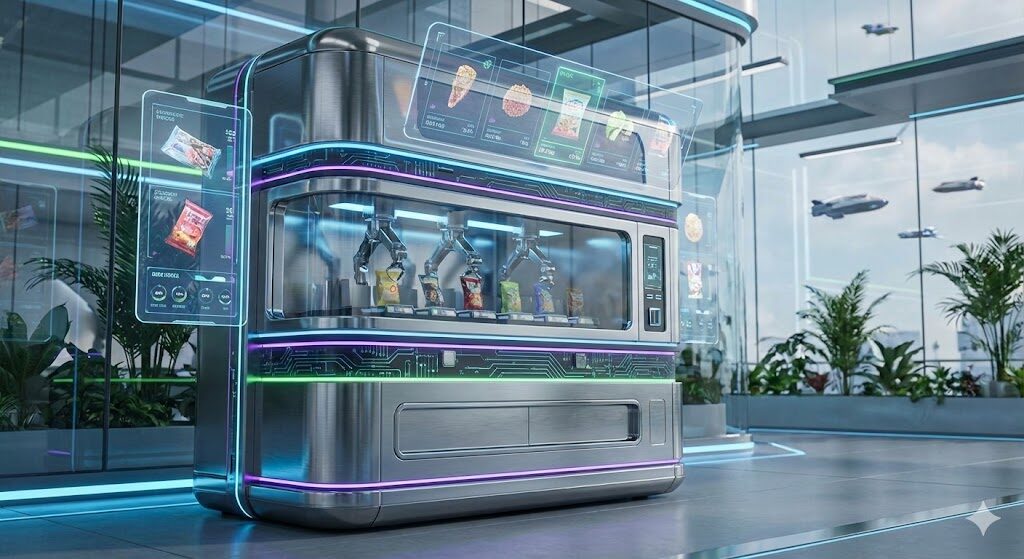 「2050年のオフィスで使われている未来のお菓子自動販売機、ホログラム表示、メタリックな質感、サイバーパンク風だが清潔感がある」