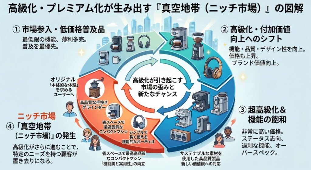 - 真空地帯理論: 既存企業が高級化へと移動した後にポッカリと空く、低価格帯の「空白のポジション(ニッチ市場)」のこと。