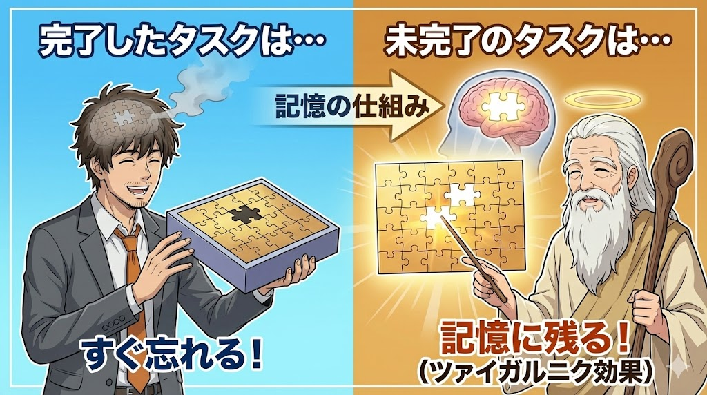 • 未完了のタスク: 脳が「まだ終わってない!」と緊張状態を保ち、常に意識の最前面に置く(気になる)。
